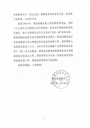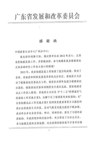 2013年1月28日,广东省发展和改革委员会致函中国质量认证中心广州分中心,对广州分中心在2012年度关心与支持该委工作,积极承担、参与低碳发展及碳排放权交易基础研究工作表示感谢,希望广州分中心能继续支持该委的低碳发展工作。
