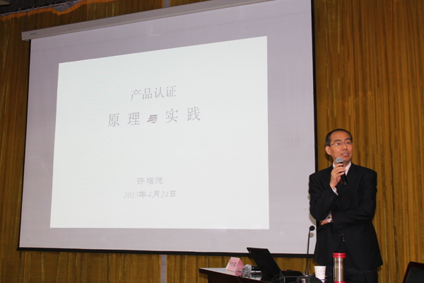 2013年4月24日,国家认证认可监督管理委员会认证监管部许增德主任赴中认新能源技术学院为600多名师生作“产品认证原理与实践”主题讲座。讲座由中认新能源技术学院副院长陈宁主持,国家认监委、中国质量认证中心相关领导到会。