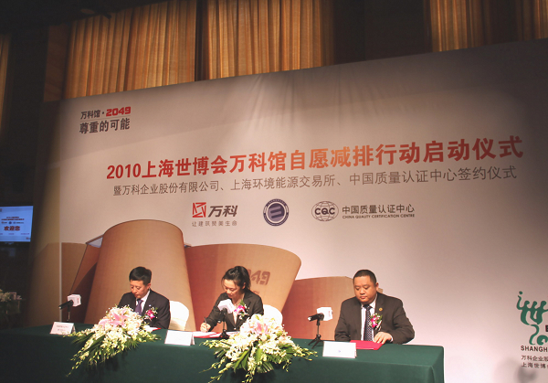 2010年2月4日,2010上海世博会万科馆自愿减排行动启动仪式在上海环境能源交易所大厅举行。中国质量认证中心(英文缩写CQC)副主任陈伟应邀参加签约仪式。万科企业股份有限公司董事局主席王石同时出席参加。