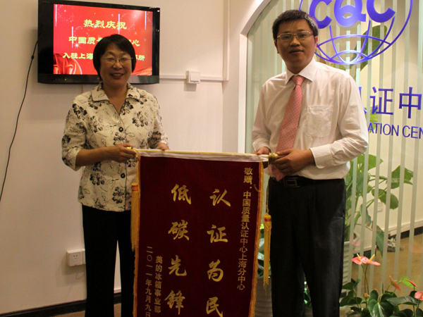 2011年9月9日,美的集团冰箱事业部至中国质量认证中心上海分中心赠予分中心“低碳先锋、认证为民”锦旗。美的集团冰箱事业部将此面锦旗亲自递交至中心主任王克娇手中。