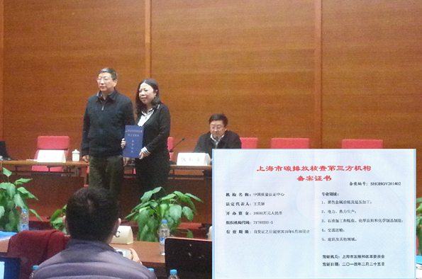 2014年3月5日,中心参加上海市发改委举办的上海市碳 排放核查第三方机构颁证会。会上,上海市发改委宣布,通过专家组评审,中心以过硬实力备案成为首批上海市碳排放核查第三方机构,获得全部5个专业领域授权开展碳排放核查工作,并为中心颁发了备案证书。