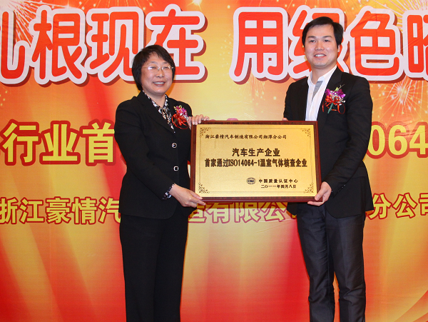 2011年4月7日,中国质量认证中心(CQC)主任王克娇为浙江豪情汽车制造有限公司(吉利汽车)湘潭分公司授发“汽车生产行业首家通过ISO14064-1温室气体核查企业”牌匾。湖南省环境保护厅、湘潭市政府部门等单位的相关领导出席颁证现场。